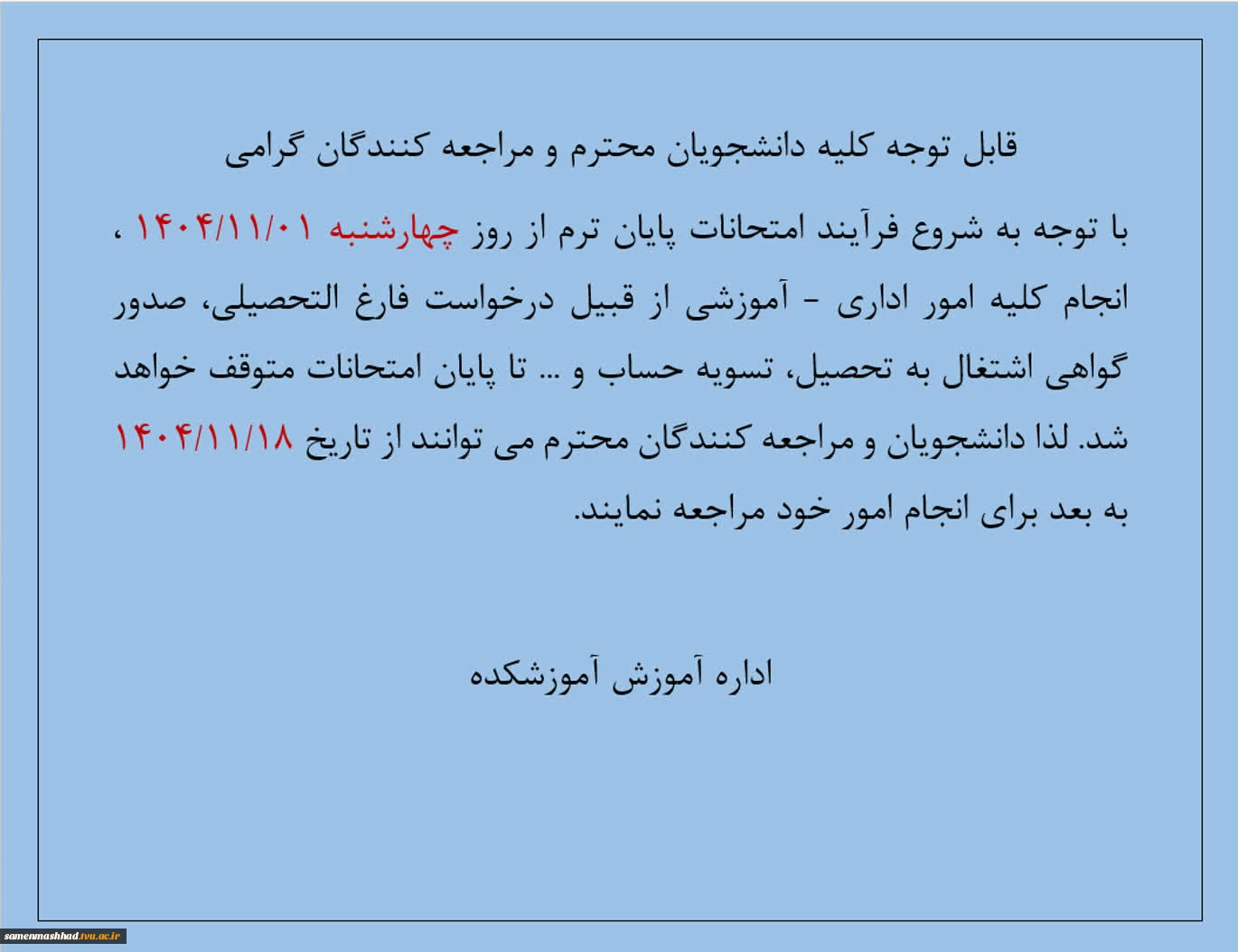 اطلاعیه انجام امور اداری و آموزشی در ایام امتحانات 2